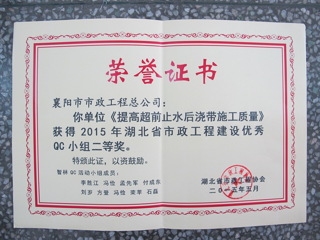 2015超前止水后浇带施工质量湖北省优秀QC二等奖