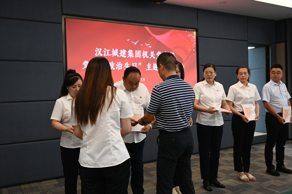 在实践锻炼环节,党支部组织7月份加入中国共产党的党员同志集体过“政治生日”。党委副书记、副董事长、总经理蔡军分别向6名过“政治生日”的党员同志赠送了“政治生日”贺卡,以及党史书籍等生日礼物。沈玲莉、陈辉、丁萌3名同志作为党员代表,围绕“三忆三问三思”发表政治生日感言,从个人成长、工作经历、对党性的感悟等方面,分享了自己入党的心路历程,用朴素的语言、真挚的情感表达了爱党爱国的热情,表示将坚定理想信念,以此次政治生日为新起点,继续用实际行动铭记入党初心,践行全心全意为人民服务的使命。
